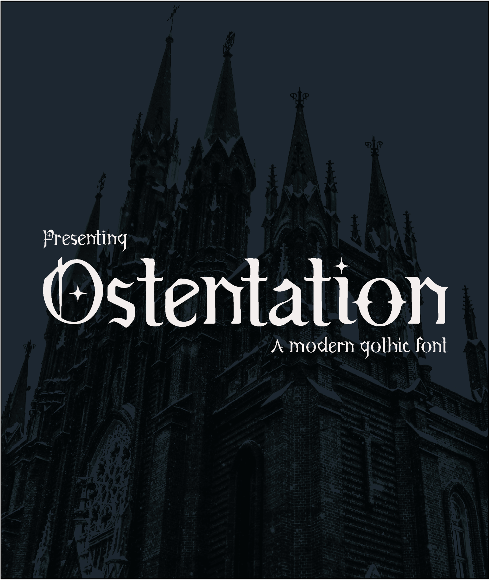 Ostentation is a display typeface that merges modern typographic structure with ornate, fantasticle Gothic influences, resulting in letterforms that feel both contemporary and mythic. Sharp angles and refined serifs are paired with decorative flourishes and dramatic curves, creating a balance between elegance and theatricality. Designed for titles, posters and visual identities that aim to feel opulent or otherworldly.